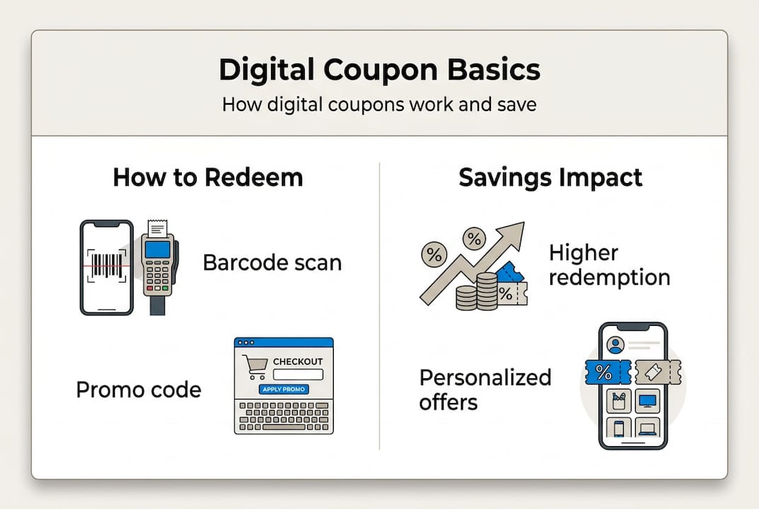 A digital coupon is any discount offer you access through a screen rather than a printed page. That covers everything from a barcode you pull up on your phone at the register to a promo code you type in at online checkout. The format has exploded because it is faster, cheaper to distribute, and far easier to personalize than paper.