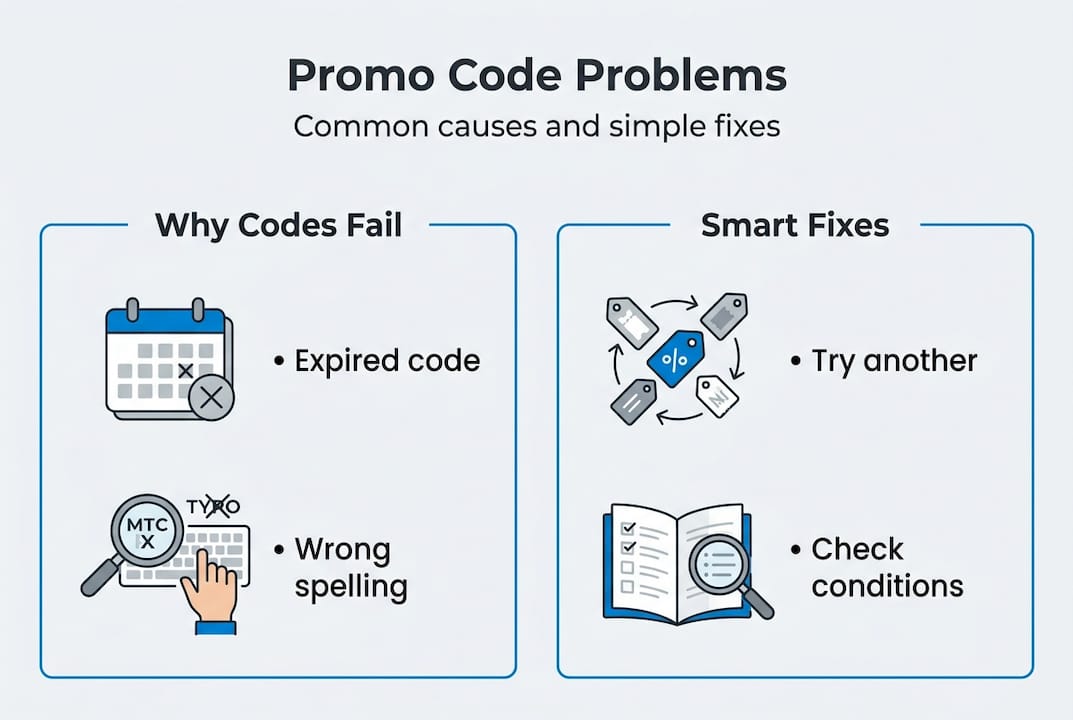 Common promo code limitations include expired codes, exceeded usage limits, minimum spend not met, excluded items or categories, new or existing customer restrictions, no stacking of multiple codes per order, and sale item exclusions. Most of these are intentional design choices, not glitches.